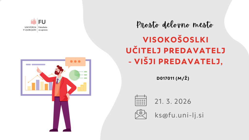 novice Objavljeno 17.03.2026 Prosto delovno mesto: Visokošolski učitelj predavatelj – Višji predavatelj – D017011 (m/ž)