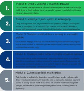 Program dvotedenske poletne šole je bil pester, vključeval pa je številne domače in tuje predavatelje, ki so pred desetletjem prav tako bili udeleženci poletne šole. Med gostujočimi predavatelji je bil tudi dr. Primož Pevcin, izredni profesor za področje ekonomike in menedžmenta v upravi na Fakulteti za upravo. Slika 1 v nadaljevanju prikazuje rdečo nit dvotedenske poletne šole – pet modulov, kateri pokrivajo pet pomembnih stebrov znotraj raziskav vodenja majhnih držav.